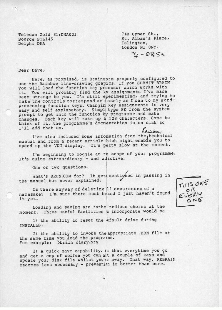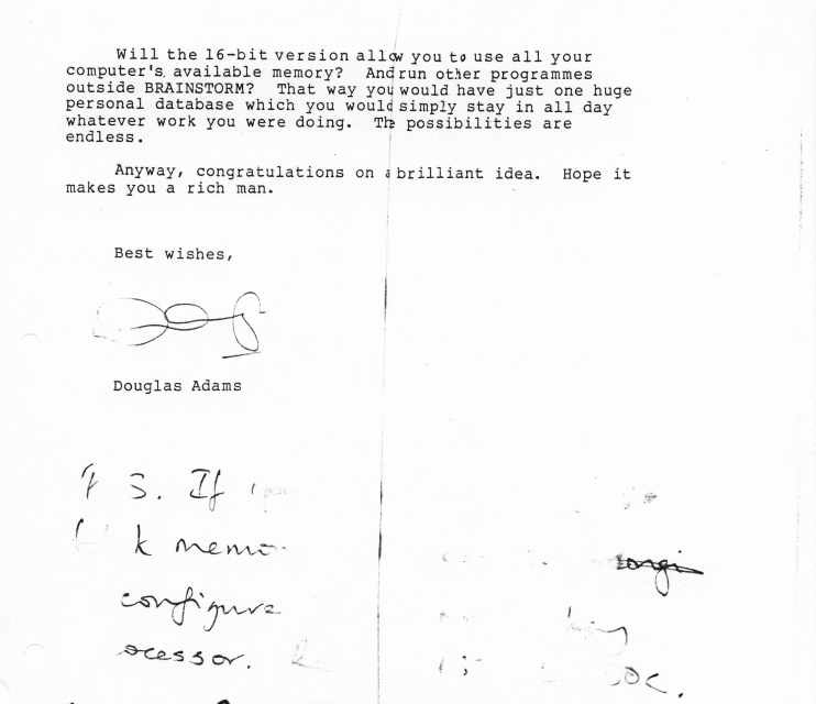 The following two images are of a fax sent by Douglas Adams to Brainstorm Software in the early eighties.
